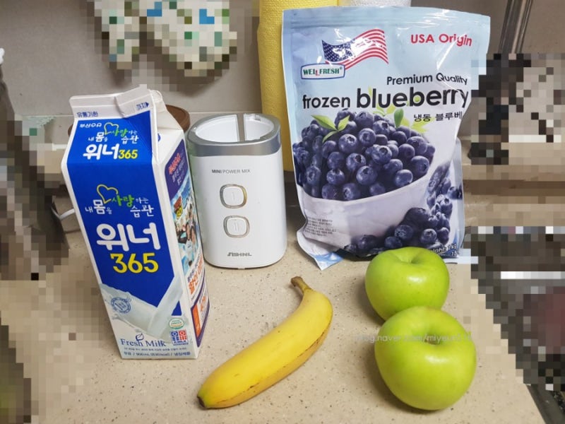 재료 : 바나나 4개, 사과 1개, 블루베리 1컵, 우유(1컵 – 종이컵 200ml) 1. 사과 1개는 껍질을 벗겨 적당한 크기로 썰고 바나나 2개도 적당한 크기로 잘라서 믹서에 넣는다..