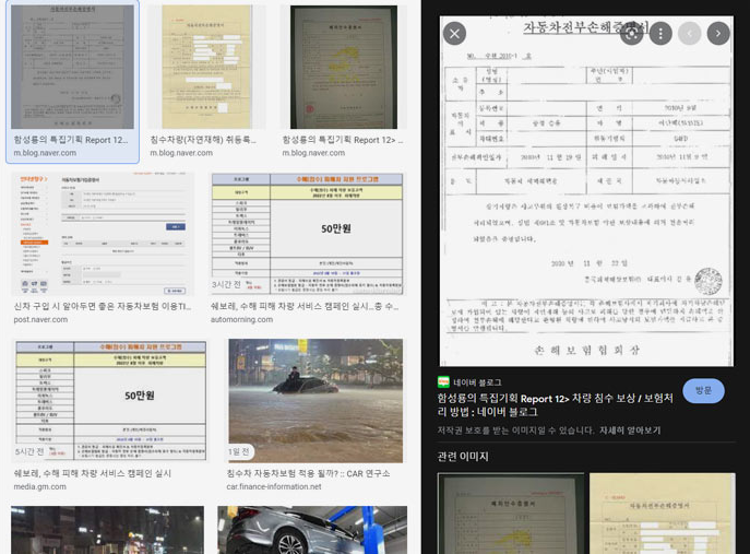 1. 자기 차량 손해 담보 및 단독 사고 보상 특약 확인 차량이 수몰되어 운행이 불가능한 상태이면 가입한 자동차 보험 자기 차량 손해 담보가 가입하고 있는지를 먼저 확인해야 합니다.보험 증권을 보면 하단에 차량 손해 담보에 가입한 점이 확인할 수 있으나 자기에 가입해도”단독 사고 보상 특약”에 가입하지 않을 경우 자연 재해 보상을 받을 수 없습니다.단독 사고는 운전자가 혼자서 담장과 기둥에 박아 차량에 파손이 발생하는 경우를 의미합니다만 사고는 발생한 것에 상대의 차량이 있지 않은 경우로 홍수 같은 자연 재해도 단독 사고와 보고 있습니다.보통 자기 차량 손해 담보에 가입할 경우 단독 사고 특약도 가입하지만 보험료를 낮추기 위해서 이 특약을 제외하는 경우가 있으며, 이런 경우에는 물에 대한 보상은 못 받대요.단독 사고 보상 특약의 경우 자동차 보험 회사마다 이름이 조금씩 다르지만, 하이커의 경우는 “자기 차량 손해 보장성 확대 특약”, 삼성 화재는 “차량 단독 사고 보상 특약”, KB손해 보험은 “자기 차량 손해 포괄”라는 명칭을 사용하고 있어 자신이 가입한 보험 회사에 문의해서 확인하는 것이 가장 정확합니다.
