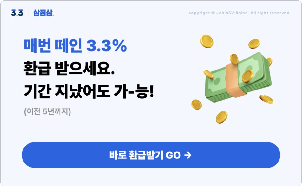 삼점삼 서비스란? 소득이 있는 사람이 3.3%의 세금 환급을 받을 수 있는 서비스로, 근로소득, 연금, 이자소득, 주식배당소득 등의 세금 환급도 받을 수 있습니다.
