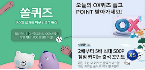 쏠야구>솔퀴즈 풀고, 신한카드 대표 플랫폼인 신한플러스 앱에서 오늘의 OX퀴즈와 출석퀴즈 풀고 마이신한포인트도 받아가세요! (최소 3포인트 ~ 최대 5,000포인트)